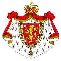 为盾徽,红色的盾面上直立着一只金色狮子,头戴王冠,持金柄银斧。金狮是力量的象征,银斧是挪威自由的保护者圣奥拉夫的武器。盾徽上端是一顶镶嵌着圆球和十字的金色王冠。