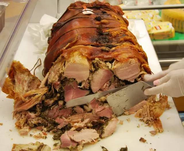 Maialino arrosto就是将猪肉放在杜松木上叉烤,另一种流行的烹饪方式是在地上挖一个洞,然后将烤架放在洞里,再将小猪或羊肉埋进去,最后分别在肉下和肉上点火,就可以了。