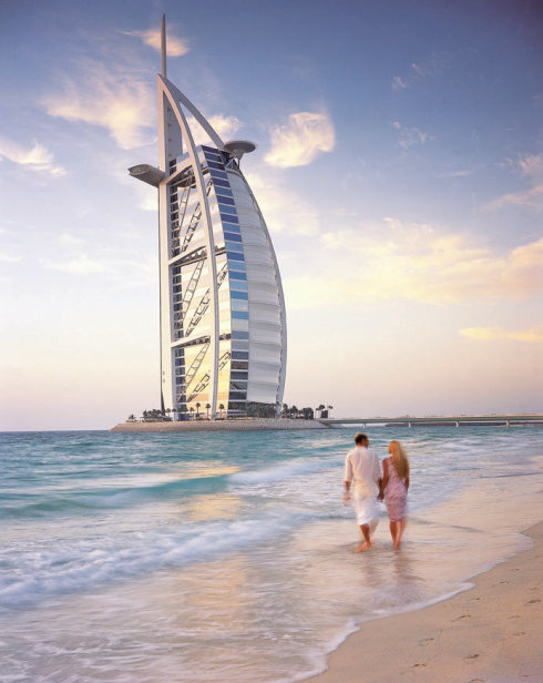 迪拜是阿拉伯联合酋长国的第二大城市。像其他中东城市一样。迪拜因石油而富裕。但对一个雄心勃勃想在新世纪大展身手的新兴城市来说,石油当然不是全部。迪拜打开了大门,大力发展旅游业。由于具有良好的自然环境以及丰富多彩的文化(因为90%的人口是委过人的缘故),到迪拜的旅游者以模特,艺术家,商人等高收入阶层居多。在迪拜王储的提议下,指明企业家AL—Mak—toum投资兴建了美伦美幻的Burj AL—Arab酒店。酒店的豪华程度让人叹为观止,评论家们都不知道给给他定为几星:是五星,六星,还是七星?酒店建在一个海滨的一个人工岛上,是一个帆船行塔状建筑,一共有56层,321米高,有英国设计师W。S。Atkins设计。他正对着Jumeirah Beach 酒店(被认为是世界上最棒的酒店),以202套复式客房,200米高的可以俯瞰迪拜的旋转餐厅以及世界上最高的中庭,成为后者最强劲的对手。到过这里之后,你才能真正体会到什么叫做“金碧辉煌”他的中庭是金灿灿的,他的最豪华的780平方米的总统套房也是金灿灿的。客房面积从170平方米到780平方米不等,最低房价也要900美元,最高的总统套房则要18000美元。总统套房在第25层,家具是镀金的。设有一个电影院,两间卧室,两间起居室,一个餐厅,出入有专用电梯。