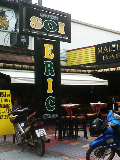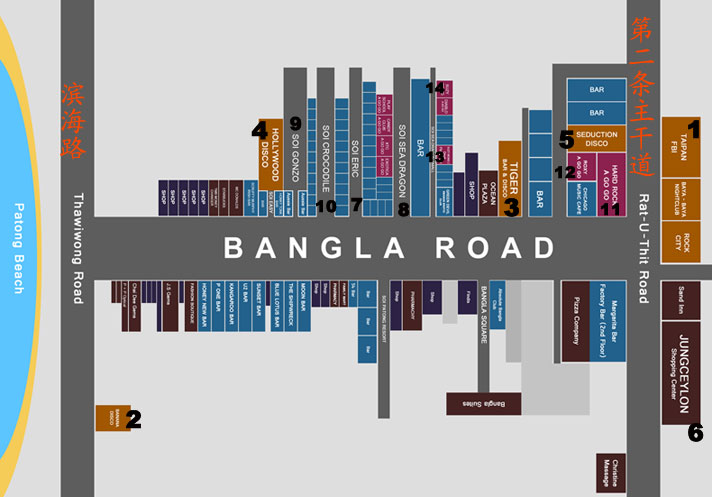 巴东的酒吧街如图所示,图上蓝色所标示的都是酒吧街的酒吧区,其中最主要的酒吧区在巴东酒吧街的tiger bar,rock city, soi eric(如图7) ,soi sea dragon(如图8),soi gonzo(如图9),soi crocodile(如图10).这几个巷子内。小巷一般在50米深度左右,两边全是酒吧,有泰国酒吧女再桌子上跳钢管舞。有时候我见到很多游客很茫然,只在街边看,不敢往里走,其实进去溜达一圈也没有什么,就算体验一下泰国小姐的热情好客,看个新鲜,走一圈就出来。有人拉你,就冲她笑一下,其实没关系,她们也是在工作。关于酒吧的注意事项,我在上一节介绍老虎酒吧的时候提到过,如果要去这些酒吧喝酒,最重要的就是别喝高了,忘了自己喝了多少,请了别人喝了多少,别当个冤大头。在酒吧里面一般会有陪酒女孩会找你玩一些游戏,如果有心情和兴趣可以陪她们玩,国内酒吧是玩骰子,这里是玩拆积木,4色连环,敲钉子。拆积木就是把垒好的积木按照你来我往的顺序,一根根拆了,在垒上去,谁把积木整垮了,就算输了。这还有点意思。4色连环,就是谁先把相同颜色的筹码连起来谁就赢,这个需要动点脑筋,不过一般是玩不过这些酒吧女,她们天天玩。所以如果谁输了谁请喝酒的话,基本上对方是个高手,我还是劝大家不要再逞能了,如果不信,不妨一试。当时候就明白我说得话了,就发表一下评论,谈谈你的心得。敲钉子,就是用小锤子的最尖一端,敲打钉子,每人一把锤子,一颗钉子,一人一下,谁最先钉进木板,谁就赢。说实话,挺无聊的,但是都是无聊的人才去酒吧,所以有兴趣就无聊的玩一下吧,也算体验一次了。