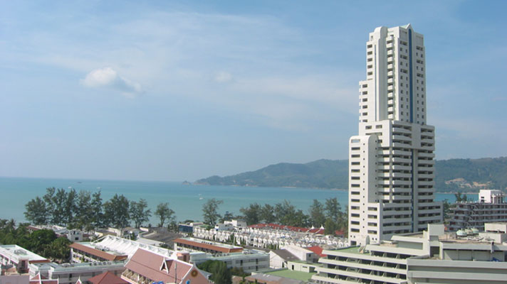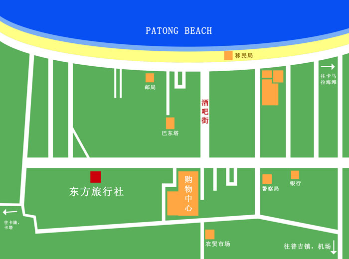巴东塔(patong tower)是巴东的最高建筑又30多层高,如果你看到这个建筑,就说明你已经在巴东市中心步行范围内了,不要打车;接着是确定方向,如果你是面对它,就说明你的左手是南方,右手是北方,你的正前方是海滩。如图所示。