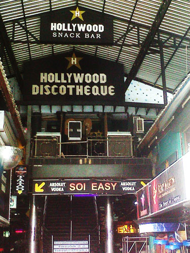 4.hollywood夜店,好莱坞夜店,这是一家泰国人和意大利人开的夜店,在酒吧街的中心,旁边是澳大利亚酒吧和爱尔兰酒吧,夜店就在两个酒吧之间,也是在2楼,门口有保安检查,其实是装样子,大摇大摆进去,上楼梯就进入酒吧,没有门票,啤酒是150泰铢一瓶,11点左右进去可以找到位置坐,因为是意大利人开的,会见到很多意大利人在这里。酒吧有内外两间,不同的音乐,以电子音乐为主。也是泰国女孩找客户地方,这个酒吧可以开到凌晨4点左右,而且是越晚越热闹。在酒吧走进去的那一间的座位是预留给会员的,游客是不可以做的,要注意,有个大汉再那里挡着。其实用不着做,在酒吧旁边点一瓶酒,就在吧台站着,你的艳遇机会更多,有一些日本人和韩国人喜欢到这个酒吧。