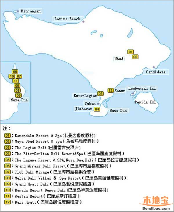 巴厘岛酒店度假村分布地图: