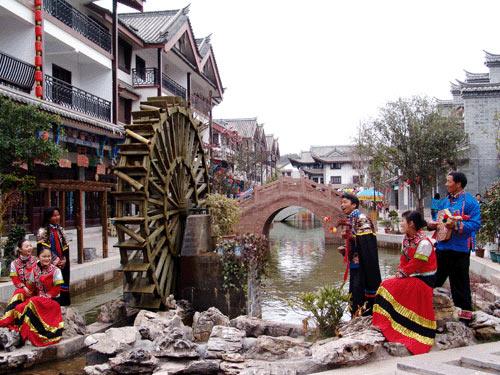 在市井商业街北面规划一个原生态村落,布置民居、打谷场、姑娘房、婚房、土主庙、村社广场等生活环境,并通过碾米、磨面、纺织、刺绣、婚礼等活动展示彝族原生态生活文化。