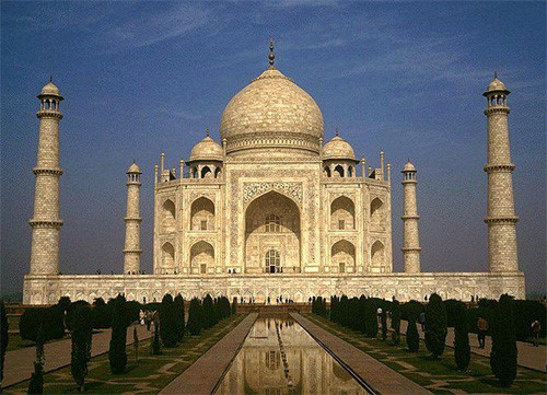 坐落于印度古都阿格的泰姬陵 是世界七大奇迹之一 到印度旅游的人士 大都是慕它的盛名而来 这座世界七大建筑奇迹背后其实有一段哀怨缠绵的历史 了解它的历史的背景 确能增加观赏泰姬陵的趣味 17世纪莫卧儿帝国皇帝沙杰汉为纪念其爱妃慕塔芝玛动用了数万名工人 以宝石镶饰 修建陵寝 图案之细致令人叫绝 泰姬陵最引人瞩目的是用纯白大理石砌建而成的主体建筑 皇陵上下左右工整对称 中央圆顶高六十二米 令人叹为观止 四周有四座高约四十一米的尖塔 塔与塔之间耸立了镶满三十五种不同类型的半宝石的墓碑 陵园占地十七公顷 为一略呈长形的圈子 四周围以红沙石墙 进口大门也用红岩砌建 大约两层高 门顶的背面各有十一个典型的白色圆锥形小塔 大门一直通往沙杰罕王和王妃的下葬室 室的中央则摆放了他们的石棺 壮严肃穆泰姬陵的前面是一条清澄水道 水道两旁种植有果树和柏树 分别象征生命和死亡