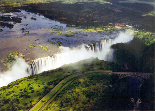 世界著名大瀑布。位于津巴布韦西北部与赞比亚交界处的赞比西河中段。赞比西河全长2700公里,是非洲大陆向东流入印度洋的最大河流。据地理学家推断,该瀑布约形成于1.5亿年前。1885年,英国传教士戴维·利文斯敦在探险时发现并以当时英国女王名字命名之。现瀑布附近有一利文斯敦铜像。津当地人称瀑布为“曼吉昂东尼亚”,意为“声若雷鸣的雨雾”。 瀑布总宽1688米,是美国和加拿大间尼亚加拉瀑布的一倍半,最大落差108米,是尼亚加拉瀑布的两倍。瀑布气势磅礴,平均秒流量1400立方米,雨季秒流量可达5000立方米。瀑布轰鸣声及高达500多米的水雾在数十公里内可闻、可见。受岩石分割,瀑布分五个部分。自西向东依次称为魔鬼瀑布(落差70米)、主瀑布(落差93米)、马靴瀑布(落差61米)、彩虹瀑布(落差108米)和东瀑布(落差101米)。瀑布巨流冲入宽仅400米的深潭,形成“沸腾锅”景观。除部分东瀑布在赞比亚境内外,其余均在津境内,因此,从津观赏瀑布,最为壮观