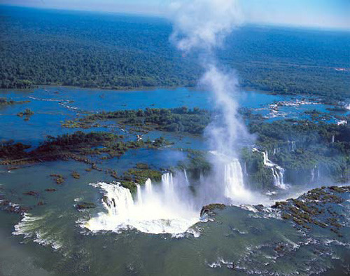 南美洲的伊瓜苏瀑布是世界五大瀑布之一,该瀑布位于阿根廷和巴西两国边境。1934年,阿根廷在伊瓜苏瀑布区建立了670平方公里的国家公园。1984年,伊瓜苏瀑布被联合国教科文组织列为世界自然遗产。 1542年,一位西班牙传教士在南美巴拉那河流域的热带雨林中,意外地发现了伊瓜苏大瀑布:层层叠叠的瀑布环绕着一个马蹄形峡谷咆哮着倾泻而下,激起的水雾弥漫在密林上空,奔流而下的水流声几公里外都能听见。 “伊瓜苏”在南美洲土著居民瓜拉尼人的语言中,是“大水”的意思。发源于巴西境内的伊瓜苏河在汇入巴拉那河之前,水流渐缓,在阿根廷与巴西边境,河宽1500米,像一个湖泊。水往前流陡然遇到一个峡谷,河水顺着倒U形峡谷的顶部和两边向下直泻,凸出的岩石将奔腾而下的河水切割成大大小小270多个瀑布,形成一个景象壮观的半环形瀑布群,总宽度3000米至4000米,平均落差80米。 伊瓜苏瀑布与众不同之处在于观赏点多。从不同地点、不同方向、不同高度,看到的景象不同。峡谷顶部是瀑布的中心,水流最大最猛,人称“魔鬼喉”。 瀑布分布于峡谷两边,阿根廷与巴西就以此峡谷为界,在阿根廷和巴西观赏到的瀑布景色截然不同。阿根廷这边分上下两条游览路线,下路蜿蜒贯穿在密林之中,可自下而上领略每一段瀑布的宏伟或妩媚,可说是10步一景;上路是自上而下感受瀑布翻滚而下的气势。在巴西那边能够欣赏到阿根廷这边主要瀑布的全景。伊瓜苏瀑布气势最宏伟的“魔鬼喉”,在阿根廷这边是从上往下看,9股水流咆哮而下,惊心动魄,同时还可以望见环形瀑布群的全景;在巴西那边是从下往上看,水幕自天而降,另有一番感受