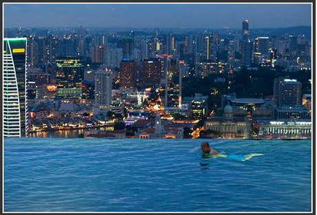 空中花园是世界上最长的楼顶泳池,目力所及大概为150米长,位于一幢高为200米的大楼顶部,因此能够俯瞰新加坡城市全景。