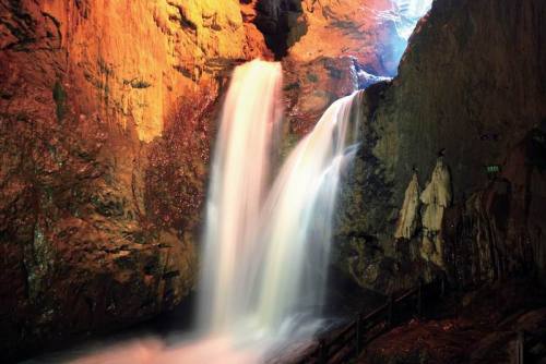 瀑布也有男女之分,说的就是位于云南宜良县九乡溶洞中的雌雄瀑布。两条瀑布一胖一瘦,一高一矮,从30多米的悬崖上倾泻而下,然后又合二为一,就像一对难舍难分的情侣。