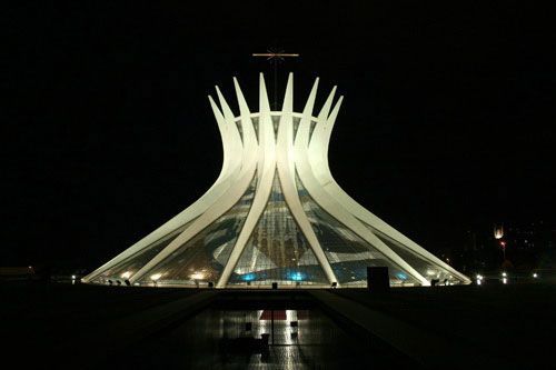 巴西利亚 巴西 奥斯卡.尼迈耶 1958为了刺激巴西国内经济,巴西政府在1960年将首都从里约热内卢迁到全新设计建设的新城,巴西利亚。这个光滑的现代主义混凝土建筑被设计来折射巴西作为具有超前意识的国家的身份。“这个教堂流线型的造型与周围的政府和公共建筑一同有助于定义一种形成中的文化的渴望。”马瑞诺说。