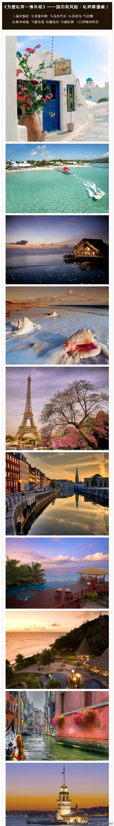 1.圣托里尼; 2.毛里求斯; 3.马尔代夫; 4.巴哈马; 5.巴黎; 6.哥本哈根; 7.普吉岛; 8.塞舌尔; 9.威尼斯 10.伊斯坦布尔