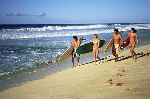 夏威夷,没有所谓季节之分,阳光明媚,微风和煦。在这里,男人们穿上印有五彩斑斓夏威夷花朵的阿哈衬衫,女士们则往往在耳朵后插上一朵香气袭人的赤素馨或披戴花环