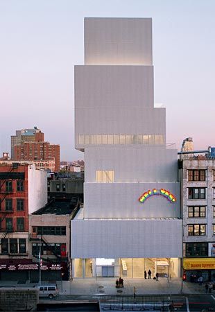 于2007年投入使用的纽约新当代艺术博物馆第二年被康德·纳斯特誉为建筑七大奇迹之一。该博物馆就像一个分层的婚礼蛋糕,其内部也陈列了很多当代的艺术作品。