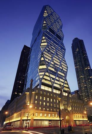 于2004年投入使用的赫斯特大厦是由英国建筑师诺曼·福斯特设计的,是赫斯特出版公司的总部。大厦由1928年竣工的六层大楼--原赫斯特总部延伸而成,共有46层。其三角的设计风格和石质的正面六层底座形成鲜明的对比。这是美国自2001年9.11后破土的第一栋摩天大楼,也是纽约的第一栋竣工的绿色办公大楼