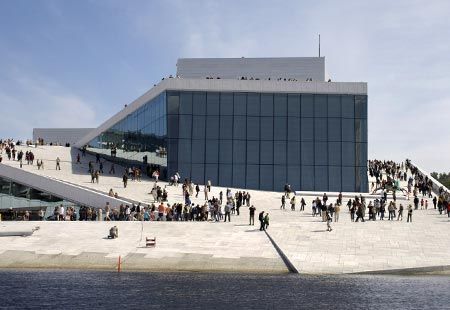 于2008年投入使用的奥斯陆歌剧院就像一座冰山一样在奥斯陆拔地而起。倾斜的大理石天台对市民开放,下面是一个有1350个座位的礼堂。奥斯陆歌剧院因其当代的建筑风格而荣获2009年度欧洲建筑密斯·凡·德·罗奖。