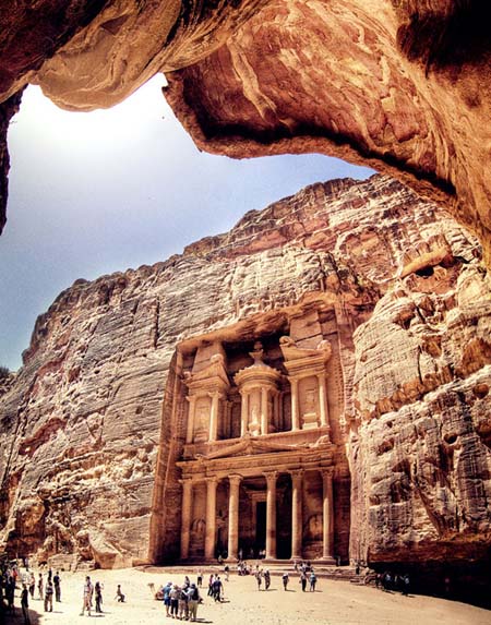 过了卡兹尼,豁然开朗处俨然是座石头城:悬崖绝壁环抱,形成天然城墙;崖壁上的断口,形成天然的进出通道。四周山壁上雕凿着更多的建筑物。有些简陋,几乎只能算洞穴;有些大而精致,有台梯、塑像、堂皇的入口和多层柱式前廊。令人呼吸困难的是,所有这一切都是玫瑰色的。