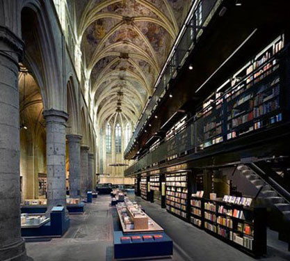 教堂书店占据了一个多米尼加教堂,有一个钢制的高耸的书架,同时保持了教堂庄严的风格。因此你可以在这里欣赏14世纪屋顶上的壁画,原来的圣坛被一个小餐厅所取代。这个有三层的书,可以通过楼梯或电梯到达。