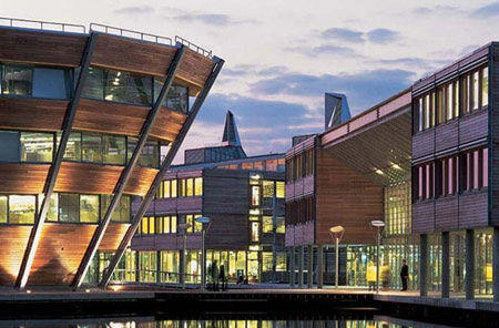 这里原来是一个生产自行车的工厂,后来被改造成了一座可容纳2500名学生的美丽“学术公园”。采用木材、钢铁和玻璃建造的美丽建筑楼坐落在宁静的人工湖畔,前端的石柱廊形成一条漫步长廊。底层设有餐馆和商店,而教师宿舍设在上层。这座学校最著名的建筑有圆形的学习资料中心和锥形的演讲厅。