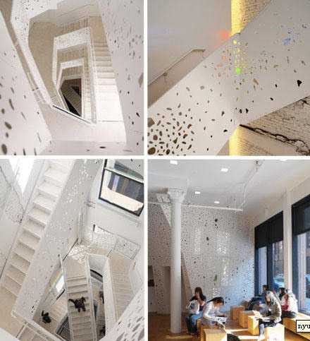 只看纽约大学哲学系的这栋教学楼不起眼的外观,你永远不会猜到内部有多么的优雅。建筑设计师史蒂芬-霍尔(Steven Holl)负责这栋大楼的内部装修设计。优雅而简约的白色墙壁象征着看上去简单却又摸不透的哲学,楼梯回栏几何造型神秘而别致,还有镂空雕花的装饰,增添优雅感。更妙的是,随着时间和季节的不同,穿过镂空花饰的光线会在墙壁和楼梯上留下不同的花样效果。