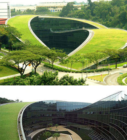 熟悉环保建筑的朋友对于绿色屋顶建筑一定早已不再陌生,不过这一座可谓是全球屈指可数的绿化屋顶教学楼建筑。它是新加坡的南洋理工大学艺术设计媒体学院的教学大楼,从远处望去,很难看出这是一座5层楼结构的建筑物,因为无论是颜色还是造型,它都与周围的环境完美融合。大楼采用了大量的玻璃幕墙装饰,可以为室内提供充足的自然光照明,草地屋顶为学生们提供了很好的会议场地。此外,绿色屋顶采用了绝缘材料,绝热降温的同时还可以收集雨水灌溉周围的植物。