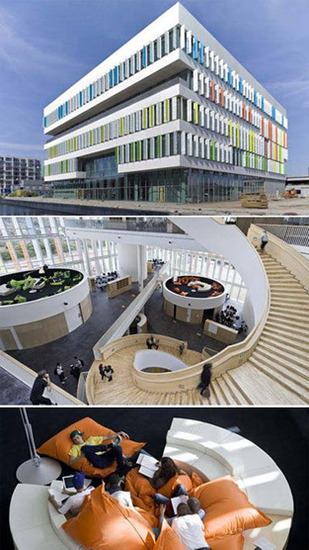 看看这座位于哥本哈根的郊区的高中校园吧,很难想象有人会不想去这里上学。这是一个完全开放式的高中,教学楼采用现代化的设计,明艳色调的彩色玻璃,可以随着太阳自动旋转的彩色窗户……整栋楼看上去就像一个玩具大盒子。而内部更是惬意:梦幻般的旋转楼梯、学生休息室的平台上提供大大的橙色枕头,学生可以坐着躺着趴着,绝对释放压力。