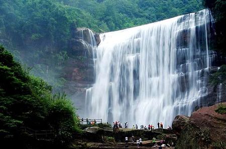 遵义地区的赤水市,被誉为“千瀑之市”,境内瀑布群、竹海、丹霞地貌等自然景观让人叹为观止。四洞沟瀑布群,离赤水城区15公里。景区是四洞沟一段约4公里的山溪间,按大致相等的距离排列着四级跌水瀑布。这四级瀑布宽40米左右,落差高者近五十米,形态各异,神韵俱佳,有如翠螺沐浴,或似新月流光,或若玉蟾戏蛇,或像云中落锦。景区内峰媚岭秀,景色优美,谷底翠竹繁茂,山间林木葱茏,溪边奇形怪状的丹霞石星罗棋布,水中天然植物盆景和丹霞石铺成的道路旁,桫椤、小金花茶等国家一级保护的珍稀植物随处可见。