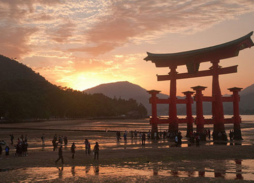 严岛神社是世界上观看落日最好的地方之一。当海水涨潮时,可以看到严岛神社宛如浮在海上一样。这是日本唯一运用潮水的涨潮退潮原理来设计的海上木造建筑物,在世界上也是罕见的。夕阳西下,这个“浮动的牌坊门”被海雾包围着,放佛在仙境中搭起了一个浪漫的框架让甜蜜的人们携手相拥。