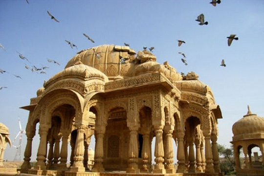 从空中俯瞰,贾沙梅尔象一粒金色的鱼子,被误抛在沙滩上,高耸的城堡就是鱼子上的点睛;自大漠远望,贾沙梅尔是一座海市蜃楼,升起在大漠之上,城市的其它部分淹没在城堡的阴影下。公元1156年,巴蒂(BHATTI)王贾沙拉(JASALA)听从隐士的建议迁都,在八十米高的特瑞库塔(TRIKUTA)山上,埋下了第一块奠基石,按拉其普特人以王名命名城市的惯例,此城被称为贾沙梅尔。拉贾斯坦邦盛产各色沙岩,多被用来建造城堡民居,以粉色用途最广,惟有贾沙梅尔对黄色沙岩情有独钟,用来建造了整整一个城市,以至于这种石头被人称作贾沙梅尔黄石。人们相信,贾沙梅尔原是天上的宫殿,只因了魔法师的咒语,一夜之间,被移到了荒凉的塔尔沙漠腹地,这事已经记载在《一千零一夜》里。