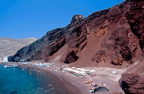 希腊的圣托里尼岛是爱琴海南部的群岛,到处都是黑色的沙子、宝石蓝和暗红的火山岩峭壁。游客只可以坐船或步行才能到达红海滩