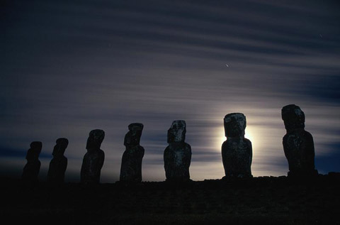 距智利海岸3800海里的南太平洋上的一个孤岛面积约180平方公里。1722年复活节这天,荷兰航海探险家雅各布·罗格文登上该岛,故而命名为复活节岛。推测10~16世纪岛上的土著民以祭神为目的所雕刻的人面巨石像高2~10米、重40~80吨、总共约1000体。这些戴着红帽子的神秘的莫亚石像的眼睛不知何故皆被人挖掉了。失掉眼睛的莫亚静静地耸立在岛上,仰视着太空。像是在默默地述着一个遥远的故事,给后人留下费解之秘和无限的遐想。1995年被认定为世界遗产 !