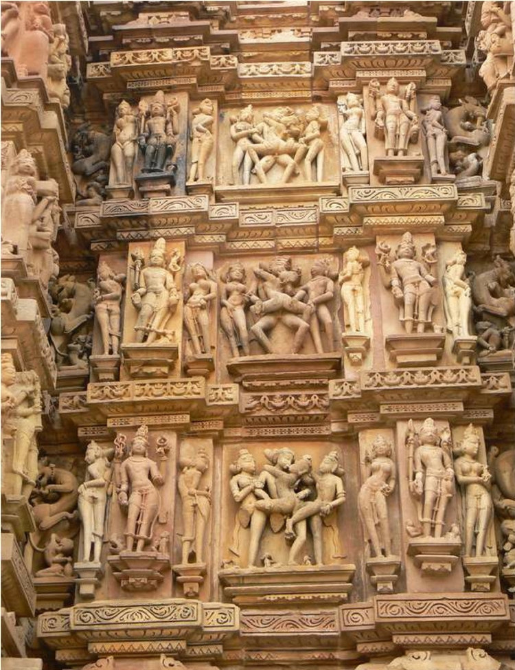 印度的性爱雕塑中最能引起人们兴趣的地方在于:它与宗教有着非常紧密的联系,所以它是完全公开的。任何一个走近克久拉霍神庙的人都会立即注意到对神和人的性活动的颂扬是其建造者的信仰体系的核心。巨大塔楼的外表装饰着石制的神祗雕像,雕刻的手法精湛,栩栩如生,极其生动的反映了印度教对人类本性的宽容与豁达。