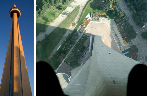 多伦多国家电视塔高1815英尺(约合550米),地处高楼林立的市中心。电视塔的观景台由一块只有两根手指粗的玻璃支撑,站在上面,你可以俯瞰周围360度城市美景。不过,望着脚下的万丈深渊,恐怕大多数游客都不敢走上去。