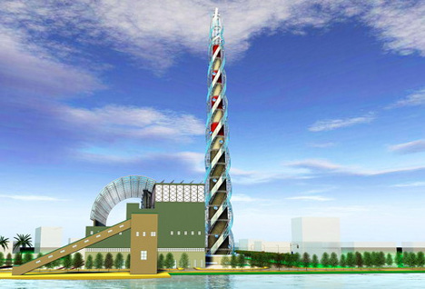 为了迎接2010年世界博览会,中国上海历史最为悠久的发电厂一座495英尺(约合151米)高的烟囱正在进行一次富有戏剧性的“大变身”。这个高耸的烟囱将被改造成一座观景塔,名为“世博和谐塔”。其外部将被包上一条条轨道,类似过山车的汽车负责将乘客运至塔顶。世博和谐塔的建造标志着这个曾经的高污染发电厂被彻底改造成一个生态友好型旅游景点,所使用的电量均来自潮汐、风力以及太阳能发电设施。