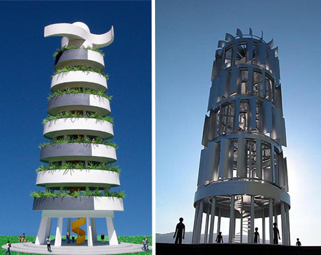 我们能够用生态友好型绿色发电塔取代外表丑陋的烟囱,同时又让它充当一个拥有观景台的公共活动场所吗?在设计师迈克尔·伽特泽看来,这个问题的答案显然是肯定的。他的一些设计作品便是遵循这样一种理念。图片中展示的风力涡轮观景塔拥有5个风力激活部分,能够沿着不同的方向旋转并产生能量。据悉,这座生态塔将建在公众聚集区域,它装有7个平台以及1个定制的风力涡轮机。