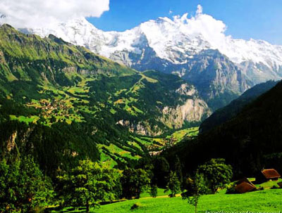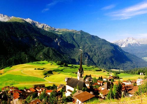 那是欧洲最大、最雄伟的山脉。绵延不绝的山峦顶着白色的山尖,在阳光下闪着金光。目光收回,脚边是芳草碧连天的丘陵和无边无际的繁花。田垄、树林、山岗仿佛在练着瑜珈,个个将身子延伸得很长;不知名的小湖、小河,像孩子眼角挂着的泪水,透着晴空般的蓝,荡漾着雪山的影子;芦苇草、蒲公英等各色野花舒舒坦坦、整整齐齐地围着明镜般的湖面。小镇上,大伞盖似的老树遮蔽出一条林荫小道。沿路前行,你会发现一个路牌,上面写着:慢慢走,欣赏啊。