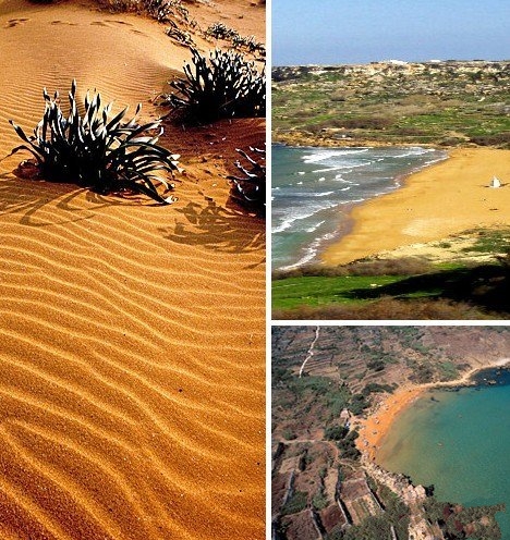 火山灰以及周围岩石中的金色石灰石共同造就了桔黄色的沙子,无数沙子汇聚在一起便形成了马耳他戈佐岛的朗姆拉·艾尔-哈姆拉湾与圣布拉斯海滩。圣布拉斯海滩面积相对较小并且更加孤立,所有这些特征使其成为这个地中海国家更适于享受日光浴和欣赏独特自然风光的所在。