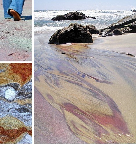 菲佛海滩位于岩块剥落的小山之下。在漫长的岁月变迁中,这些小山为海滩带来了数以十亿计的石榴石晶体。血红色的石榴石在沙子中闪闪发光,被发射的阳光让沙滩充满生机和活力。海浪的冲刷影响了这些微型晶体的外形,同时让它们呈现出一直处于变化之中的彩虹色,粉红色、红色、品红色和紫色就此成为菲佛海滩的主打色。我们的地球显然没有必要像图片所展示的那样拥有如此丰富的色彩,但这些动人的色彩也无疑说明大自然拥有很多属于自己的特效手段。