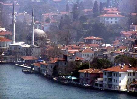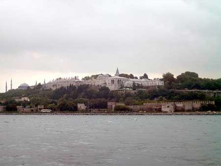 在博斯普鲁斯海峡与金角湾及马尔马拉海的交汇点上有一座辉煌的建筑,这就是从15世纪到19世纪奥斯曼帝国的中心——托普卡普皇宫,这迷宫般的豪华至极的地方,是当年苏丹们办公的地方。宫殿外侧是绿木葱郁的第一庭院,原本是宫廷餐室的第二庭院,现在成为帝国时代水晶制品、银器以及中国陶瓷器的藏馆。左侧是苏丹的后宫,当年这里发生了种种阴谋。在第三庭院有谒见室、图书馆、服装珠宝馆(可看到世界第二大的钻石)以及价值连城的中世纪的绘画书籍。宫殿的中央是圣遗物室。