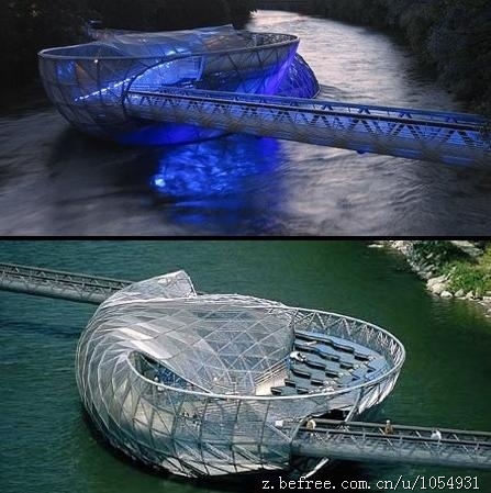 爱欧拉岛桥(Aiola Island Bridge)由美国设计师维托-阿肯西设计,横跨在奥地利格拉茨穆尔河之上。“岛”上设有日光浴区、时尚酒吧和咖啡馆。