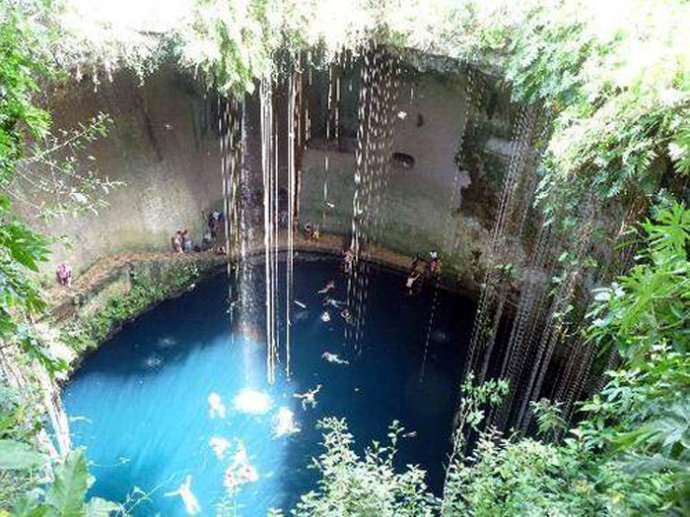 墨西哥尤克德柔诺特天坑是潜水者的最爱,游客只需付过门票,就可在自然形成的天井游泳池中畅游,时而跃出水面的鱼使这里充满了生机。由于四周耸立着藤蔓缠绕的石墙,请游人切记不要俯冲入水,以免受伤。