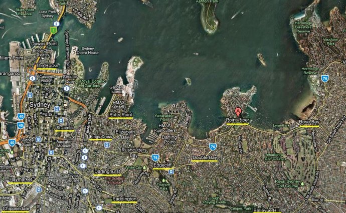 半岛探进悉尼港湾(亦称Port Jackson)。她的东面是Rose Bay,西面是Double Bay,驾车走New South Head Road,在旣将走过Double Bay时,见红灯,左转,就是Wolseley Road。