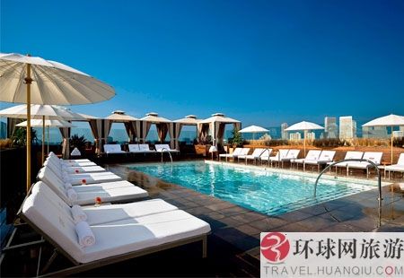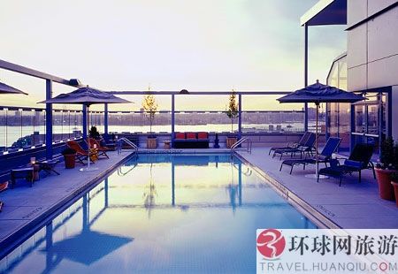 Gansevoort Meatpacking酒店有一个45英尺的加热泳池,有水下音乐,南岸还有彩灯。屋顶还有一个花园,20英尺高的屋顶的阁楼和壁炉。