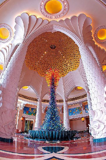 这座耗资百亿人民币的亚特兰蒂斯酒店Atlantis the Palm拔“海”而起,大手大脚惯了的迪拜在建酒店这事上可谓极尽奢华之能事,棕榈岛亚特兰蒂斯酒店的最大噱头就是“成为一个主打海洋主题的家庭娱乐胜地”。所以他们请来了来自南太平洋的各种海洋贵客,建起了一个养6万多条鱼的巨型水族缸和一个可容纳数十条宽吻海豚的海豚馆。顶楼的套房拥有3个卧室和3个浴室,还配有一张可供18人用餐的金叶餐桌,每晚的入住费高达20万人民币。