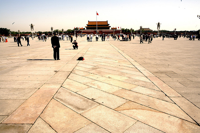 天安门广场是全世界最大的广场,同时是全中国最庄严的历史性建筑。广场周围建有斯大林式纪念碑与政府楼;五星红旗高高地飘扬在广场的最北端,每天都会有隆重的升旗与降旗仪式在这里举行;四座大理石雄狮伫立在广场正前方。