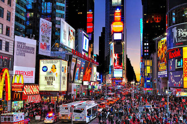 时代广场位于美国纽约,坐落于百老汇大街与第七街交汇处,东西向从西42街至西47街,以每年新年前夜的“降球”活动而闻名。这是一座极其繁华缤纷的大广场:各色的电视式宣传板、耀眼的霓虹光管广告、五花八门的彩色光束充斥着广场大街的各个角落,虽然有部分游客甚至无法忍受这种“热闹”,但富有大都市气氛的时代广场依然为众多游客所喜爱。此外,它也是一个适合家庭出游的主题公园,这里饭店、剧院、酒店遍布,俨然一个繁荣发展中的商业区。各种灯光虽然全天照射,但夜晚时分,这些彩灯有了夜幕的衬托,时代广场也更显繁华而诱人的一面。