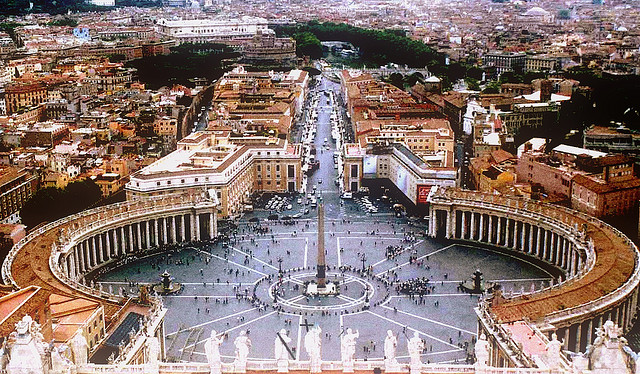 圣彼得广场位于罗马梵蒂冈圣彼得大殿正前方。四列托斯卡纳式巨型圆柱伫立在这座壮观的椭圆形广场周围,使整个广场的入口处呈梯形状。广场正中央坐落着一座埃及方尖碑,它是罗马奥古斯都皇帝统治时期从埃及运送至此,并于1586年在前罗马教皇西克斯图斯五世的指示下最终竖立于广场中心。方尖碑顶部有一个镀金球,中世纪时被认为里面装着凯撒大帝的骨灰。但是当镀金球被移走后,最终里面只发现一些灰尘。