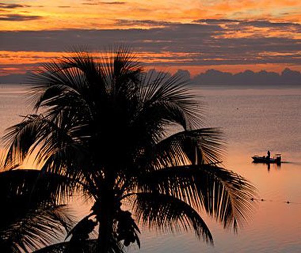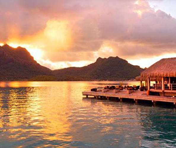 即使天气不作美,Bora-Bora岛还是一样漂亮--海拔2385英尺的Otemanu死火山轮廓倒影在绿水白滩上,一望无际,漂亮极了。您与心上人到附近的四间度假村(的瑞吉, 四季酒店, 艾美酒店和洲际酒店和海水浴温泉)买个“前排位”观日落,毫不浪漫。