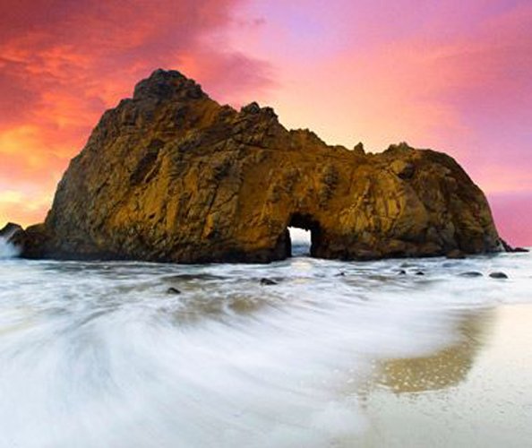 坐落于Los Padres国家公园森林深处的Pfeiffer海滩混合的紫砂、巨型红杉,和橡树真是七彩奇妙的一幕!各形各样的海栈布满在无边无际的海面上—其中一个中间有个洞口,大家把它称为“一道门”,仿佛一个框架,衬托出夕阳的光辉。