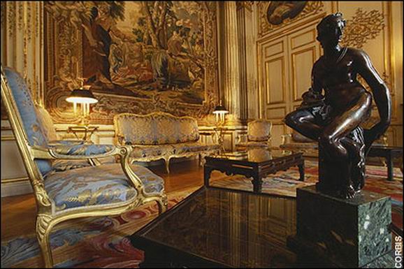 爱丽舍宫(ElyséePalace)是法国总统官邸,巴黎重要建筑之一。爱丽舍宫是一座有大石块砌成的二层楼建筑。主持左右对称的两翼是两座平台,中间环抱着园庭,外型朴素庄重。宫殿后部是座幽静、秀丽的花园。爱丽舍宫内部处处金碧辉煌。每间客厅的面壁都有镀金细木装饰,墙上悬挂著名油画和精致挂毯,四周陈设着17--18世纪的镀金雕刻家具和珍奇艺术品,以及金光闪闪的座钟和大吊灯,使这里宛若是一座博物馆。