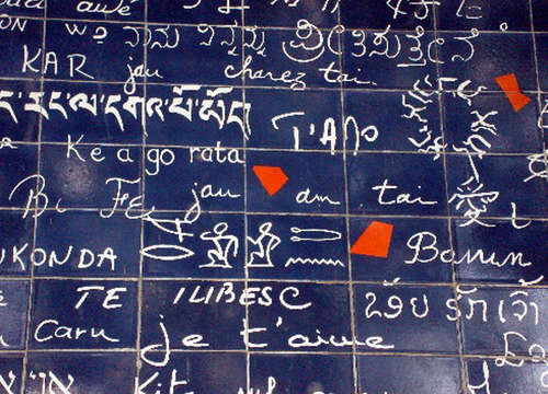 爱墙坐落于巴黎市北蒙马特高地半山腰上的一个小公园里。蒙马特高地是巴黎文人聚居的地方,这里有著名的圣心大教堂、红磨房。一面约40平方米,由511块深蓝色的长方形石砖组成,墙上用311种语言写着同样的主题——“我爱你”。在墙的上方有一幅画,画中是一位身穿深蓝色吊带裙的女孩,斜倚在一张小桌旁,画旁边有一行小字:“保持理智,勿要强求”。如果细心寻找,在墙壁左侧,就可以找到中文繁体“爱”字。每年,无数的情侣们来到这里,拥抱、接吻,使这里成为了巴黎最著名的“爱情地标”。